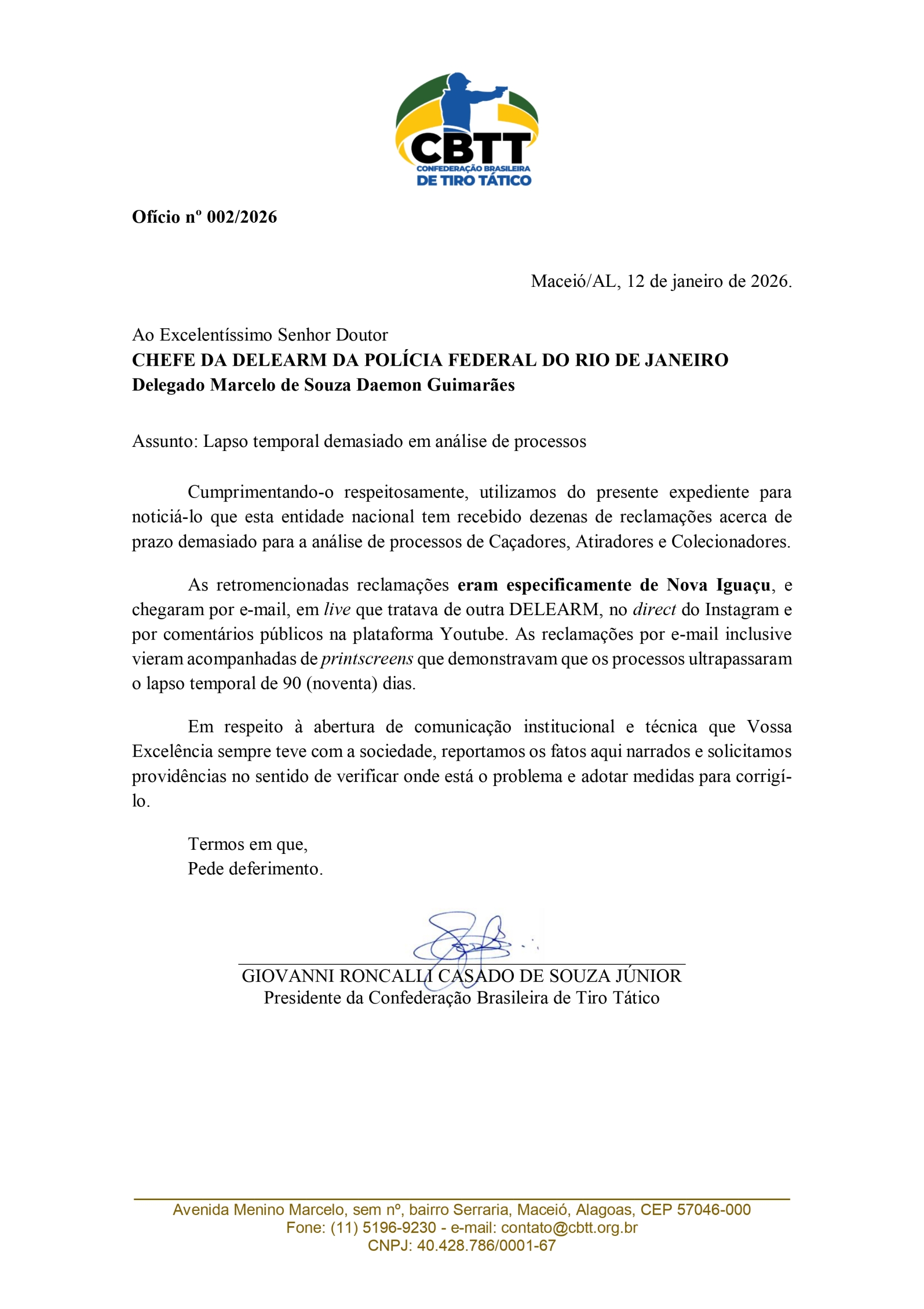 A Confederação Brasileira de Tiro Tático (CBTT) informa que, em 12 de janeiro de 2026, encaminhou ofício institucional à Chefia da DELEARM da Polícia Federal do Rio de Janeiro, relatando reclamações recebidas quanto ao excessivo lapso temporal na análise de processos de Caçadores, Atiradores e Colecionadores (CACs).