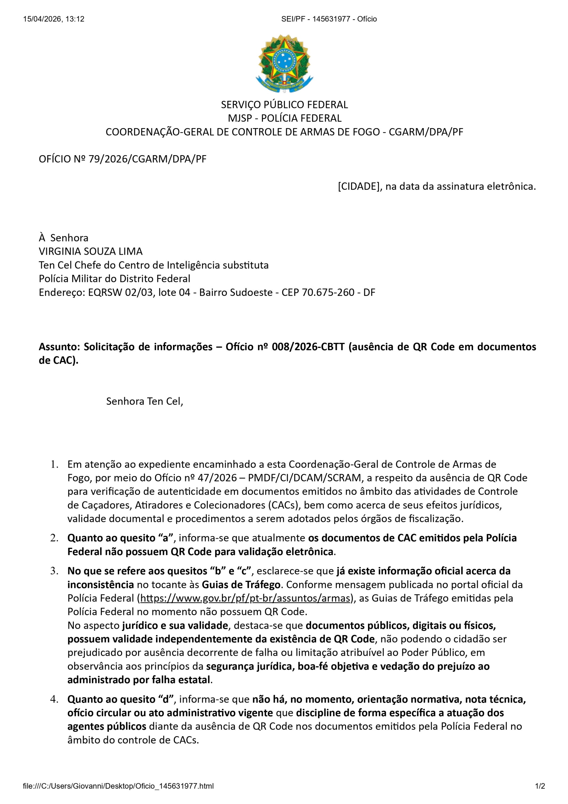 PF responde PM/DF sobre ofício da CBTT da ausência de QR Codes