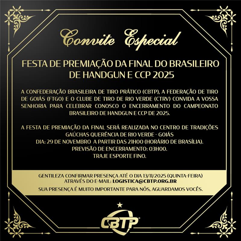 É com grande honra que a Confederação Brasileira de Tiro Tático (CBTT) anuncia sua participação na festa de encerramento do Campeonato Brasileiro de IPSC Handgun e CCP de 2025, promovida pela Confederação Brasileira de Tiro Prático (CBTP).