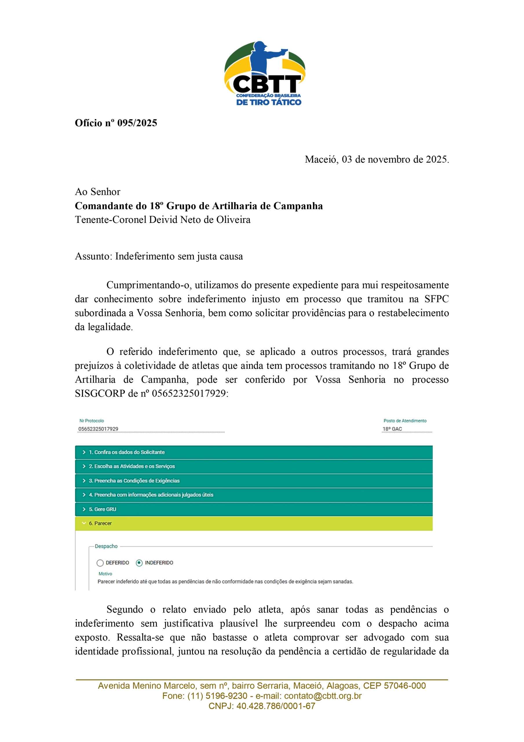 A Confederação Brasileira de Tiro Tático (CBTT) havia enviado o Ofício nº 095/2025 ao Comandante do 18º Grupo de Artilharia de Campanha denunciando um indeferimento sem justa causa no processo SISGCORP de um atleta, mesmo após ele ter sanado todas as pendências.