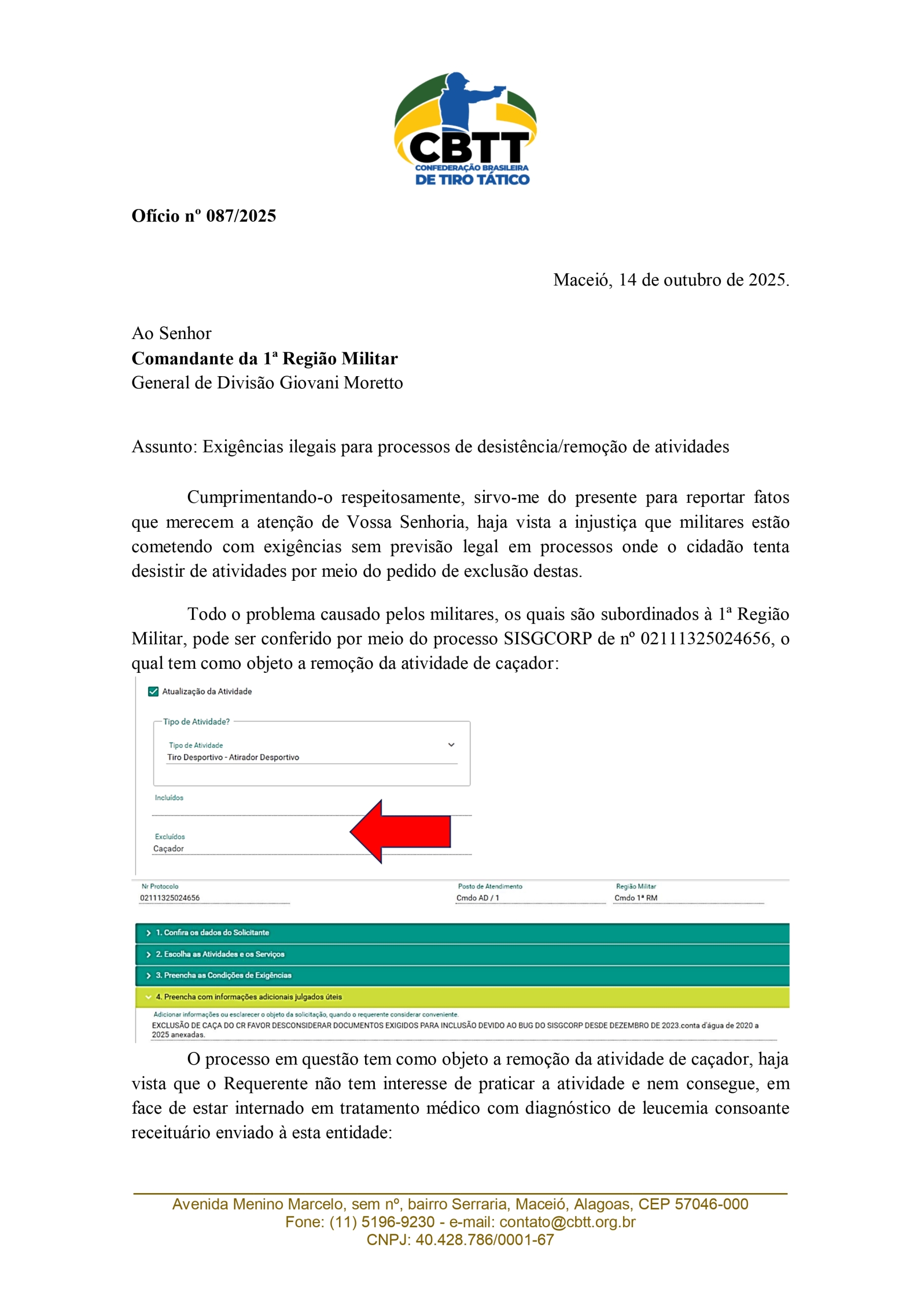 A Confederação Brasileira de Tiro Tático (CBTT) protocolou o Ofício nº 087/2025, endereçado ao Comandante da 1ª Região Militar, General de Divisão Giovani Moretto, denunciando exigências ilegais impostas por militares subordinados à 1ª RM em processos de remoção ou desistência de atividades no sistema SISGCORP.