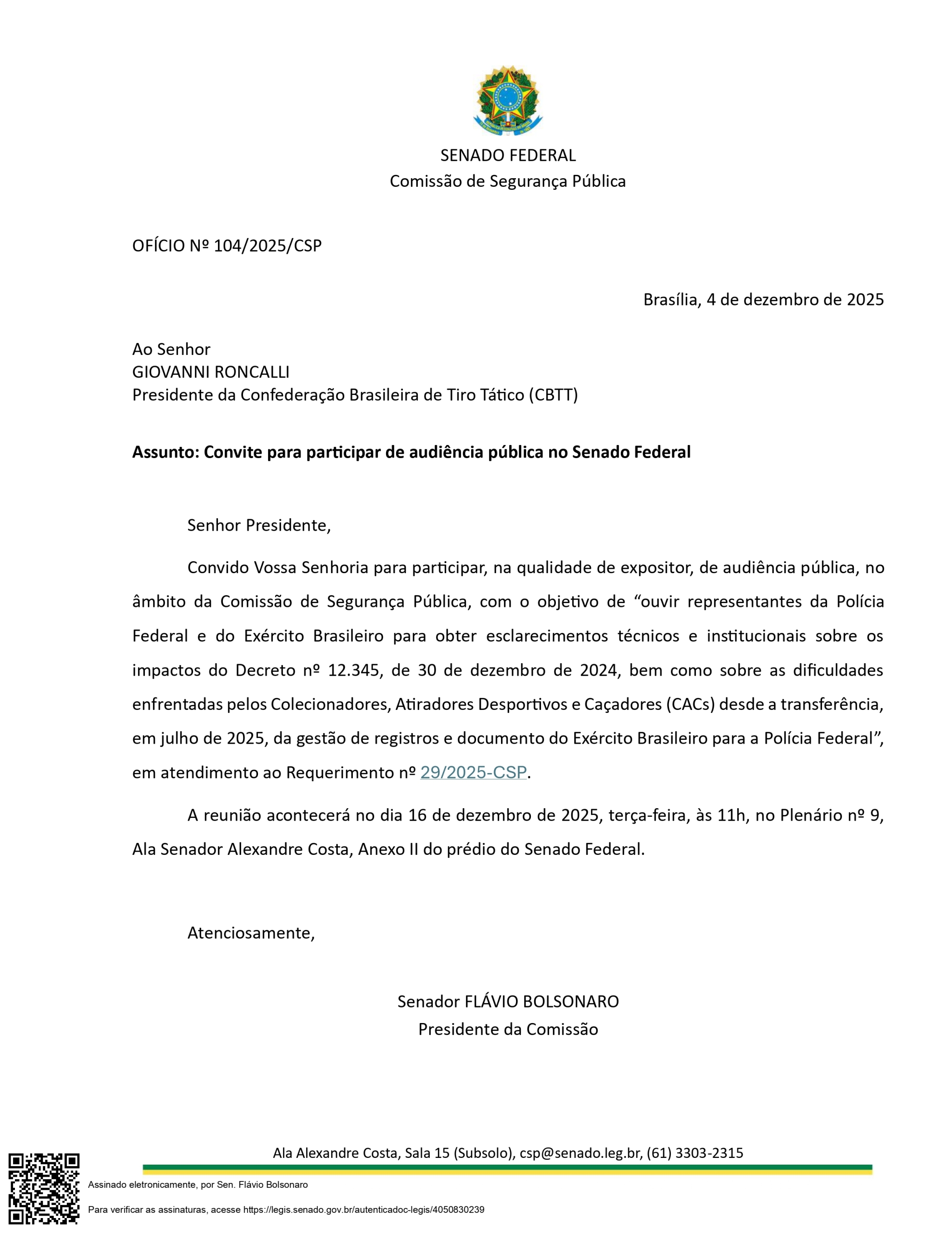 A Confederação Brasileira de Tiro Tático (CBTT) informa que seu presidente, Giovanni Roncalli, recebeu o Ofício nº 104/2025/CSP, enviado pelo Presidente da Comissão de Segurança Pública do Senado Federal, Senador Flávio Bolsonaro, convidando-o a participar, na qualidade de expositor, da audiência pública marcada para o dia 16 de dezembro de 2025, às 11h, no Plenário nº 9, Anexo II do Senado Federal.