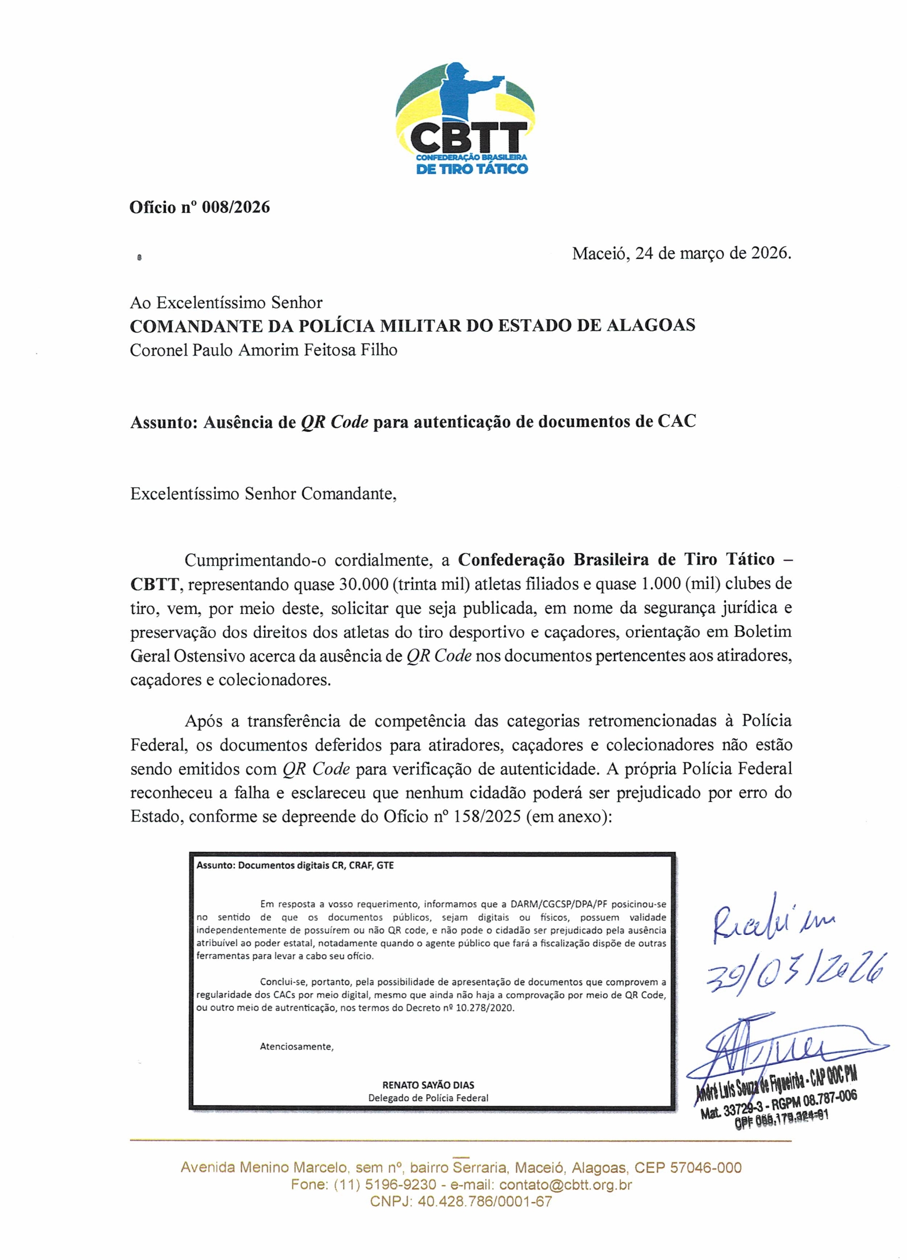 A Confederação Brasileira de Tiro Tático (CBTT) informa que, no dia 30/03/2026, esteve na sede da Polícia Militar do Estado de Alagoas para diligenciar acerca do Ofício nº 008/2026, que trata da ausência de QR Code nos documentos dos CACs .