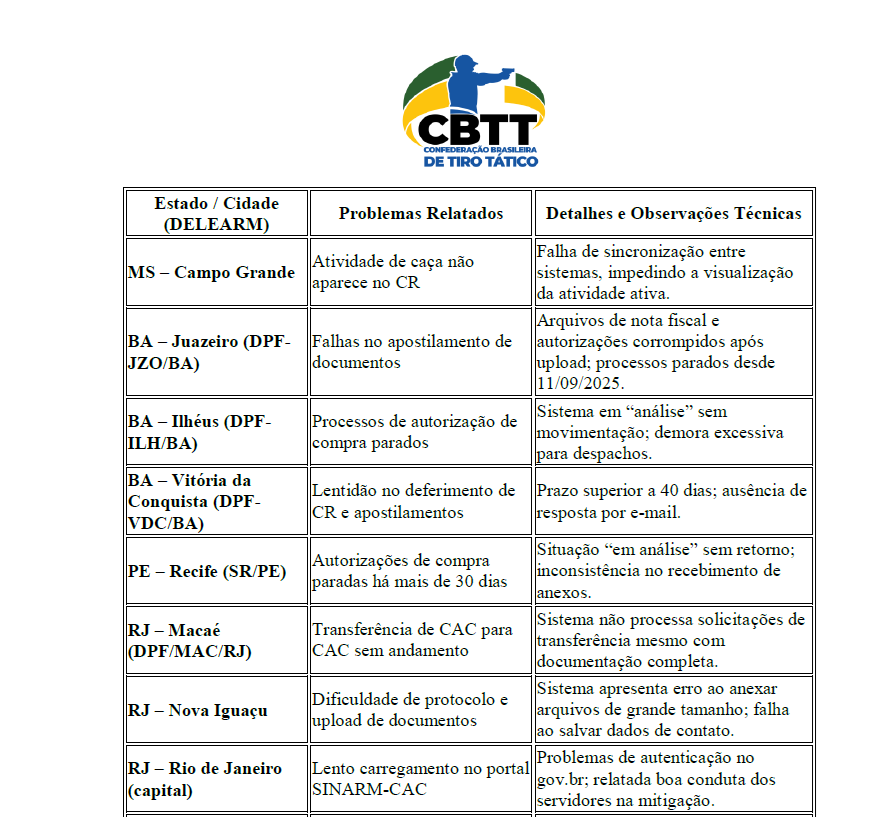 A Confederação Brasileira de Tiro Tático (CBTT) protocolou o Ofício nº 091/2025 junto à Coordenadoria-Geral de Controle de Armas de Fogo (CGARM/DPA/PF), relatando falhas operacionais identificadas em diversas DELEARMs de todo o país.
