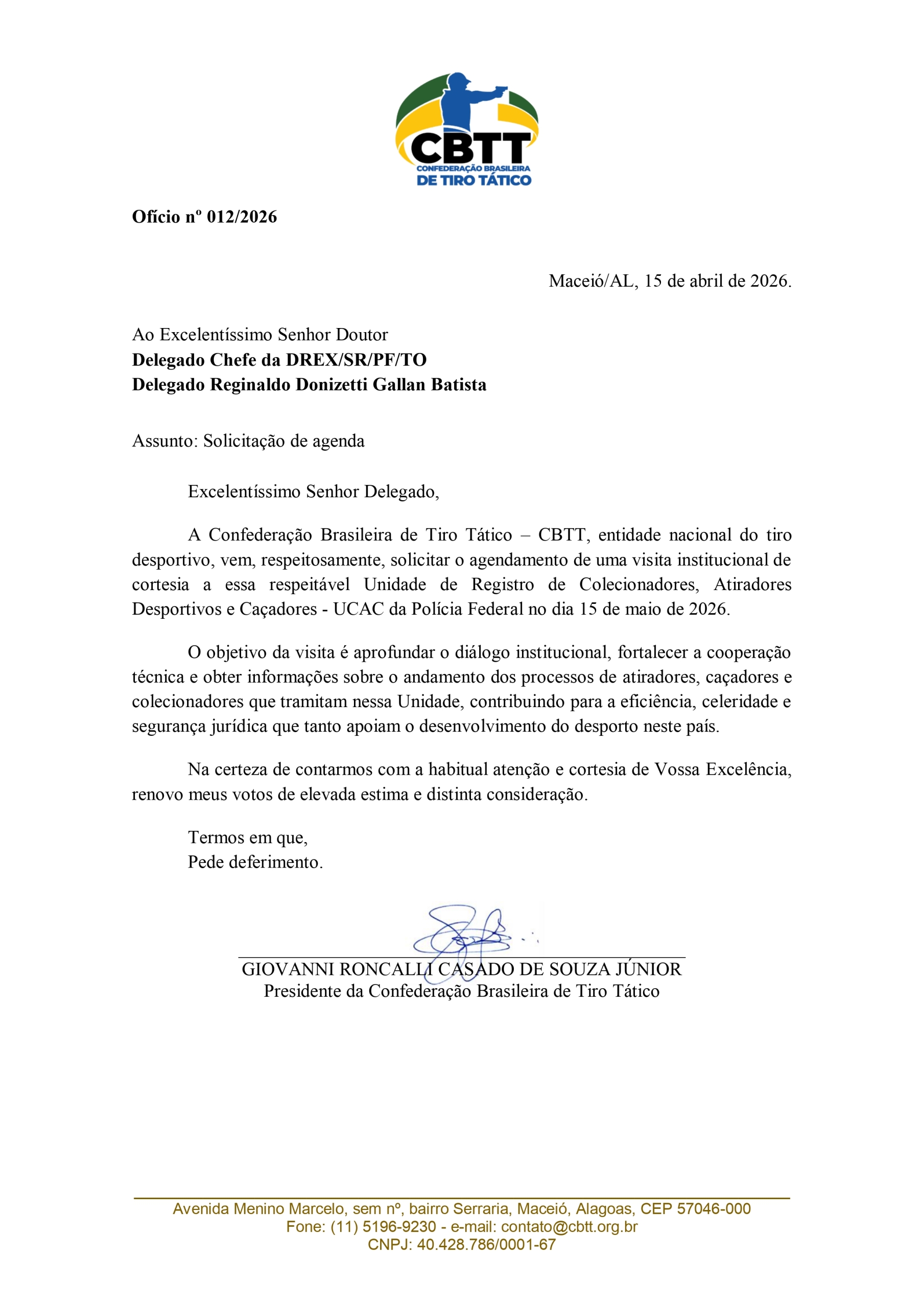 A Confederação Brasileira de Tiro Tático (CBTT), por meio de seu presidente Giovanni Roncalli, formalizou pedido de reunião institucional com autoridade policial, com o objetivo de apresentar demandas da coletividade de atletas e caçadores vinculados à respectiva delegacia.