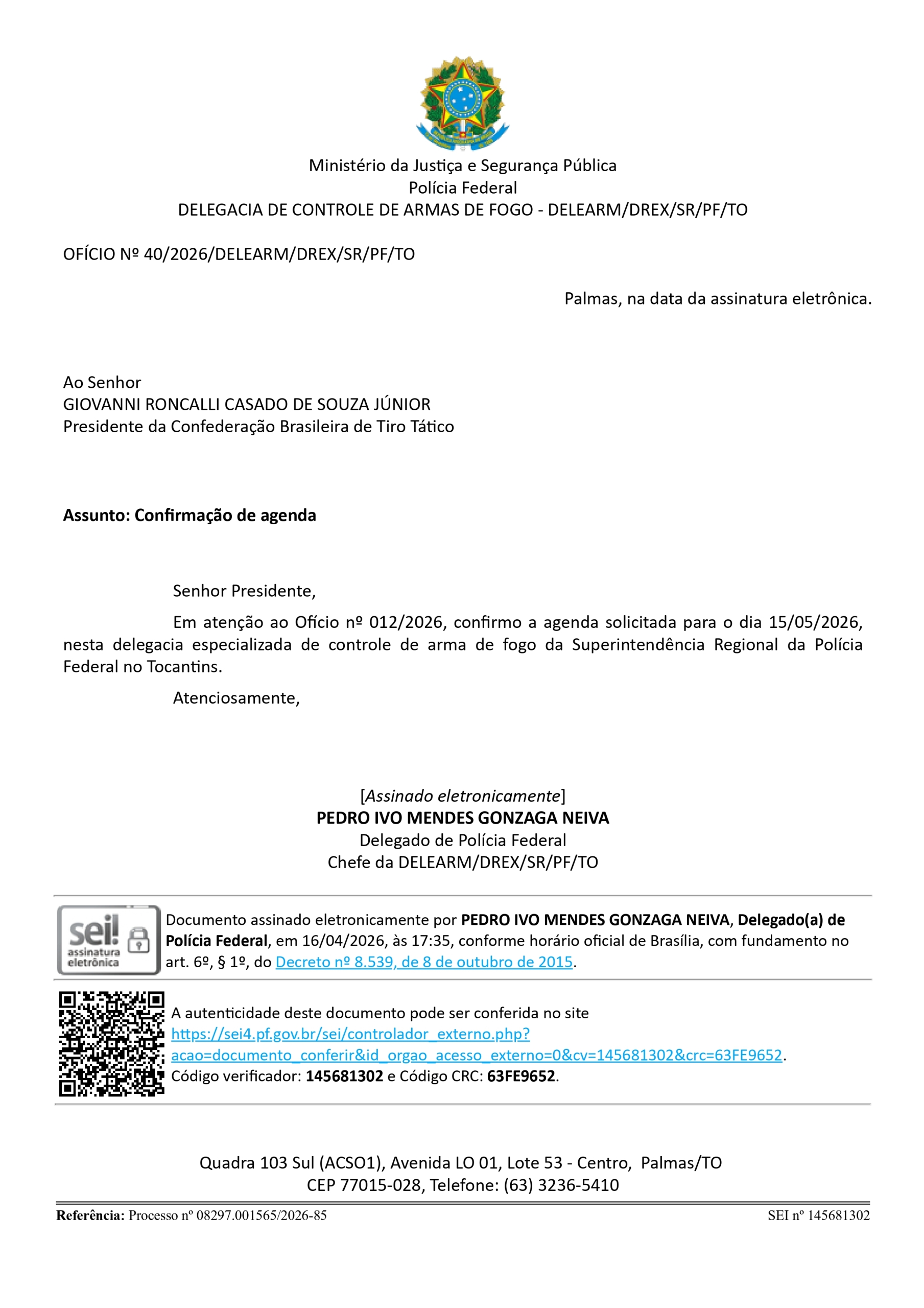 A Confederação Brasileira de Tiro Tático, representada por seu presidente, Giovanni Roncalli, em conjunto com o PL Defesa, por meio de seu presidente Odair Alves, estará presente no Estado do Tocantins para uma importante agenda institucional junto à Polícia Federal.