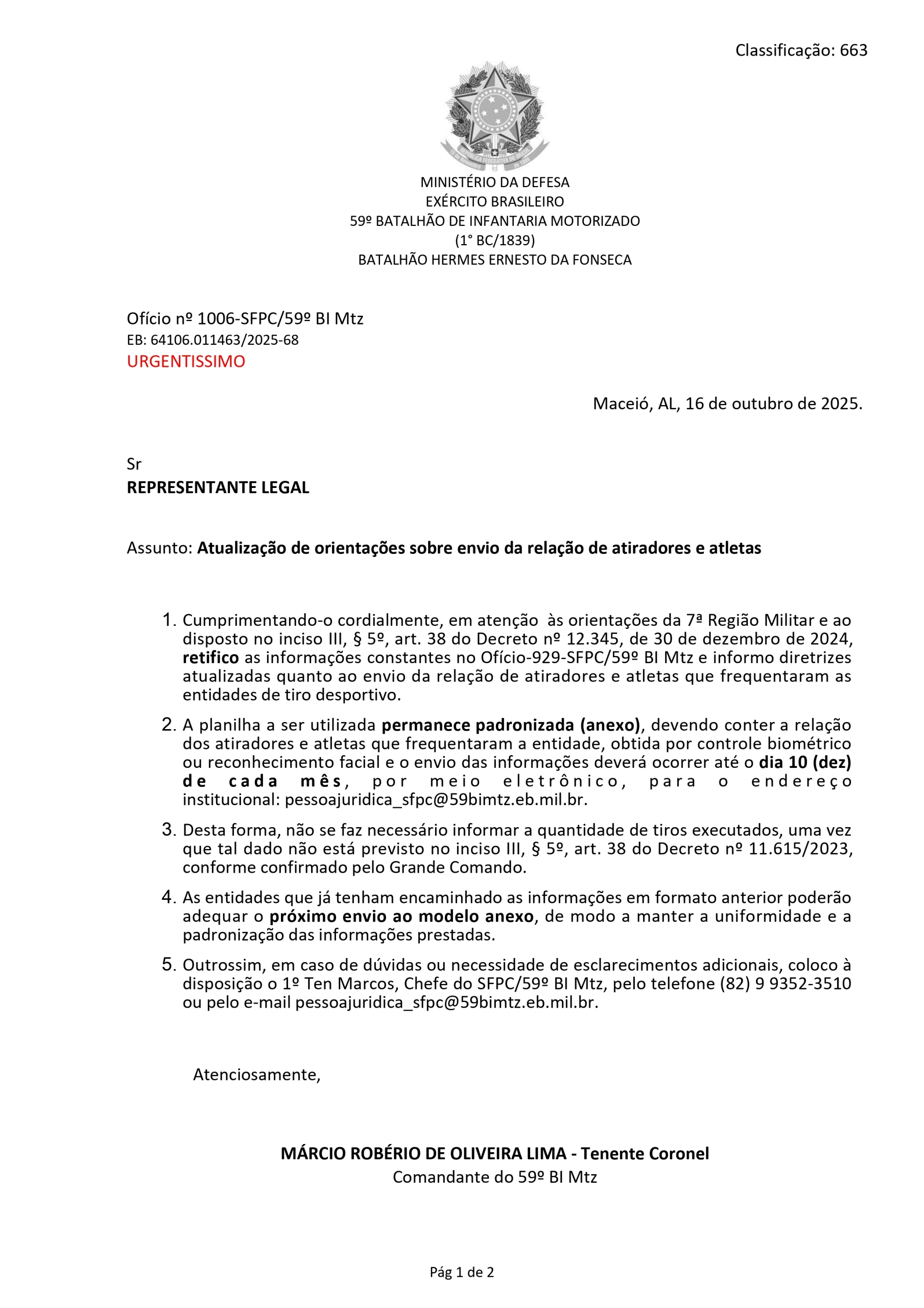 👉 O novo Ofício nº 1006-SFPC/59º BI Mtz, expedido em 16 de outubro de 2025, revoga a cobrança de informações sem previsão legal, como a quantidade de disparos realizados e prazos reduzidos de envio.