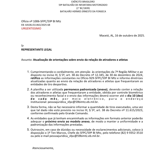 A Confederação Brasileira de Tiro Tático (CBTT) enviou o Ofício nº 094/2025 ao Comandante do 12º Batalhão de Infantaria Leve de Montanha, Coronel Murilo Albiero,