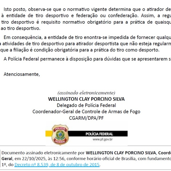 A Confederação Brasileira de Tiro Tático (CBTT) recebeu, no dia 22 de outubro de 2025, o Ofício nº 71/2025/CGARM/DPA/PF, assinado pelo Delegado de Polícia Federal