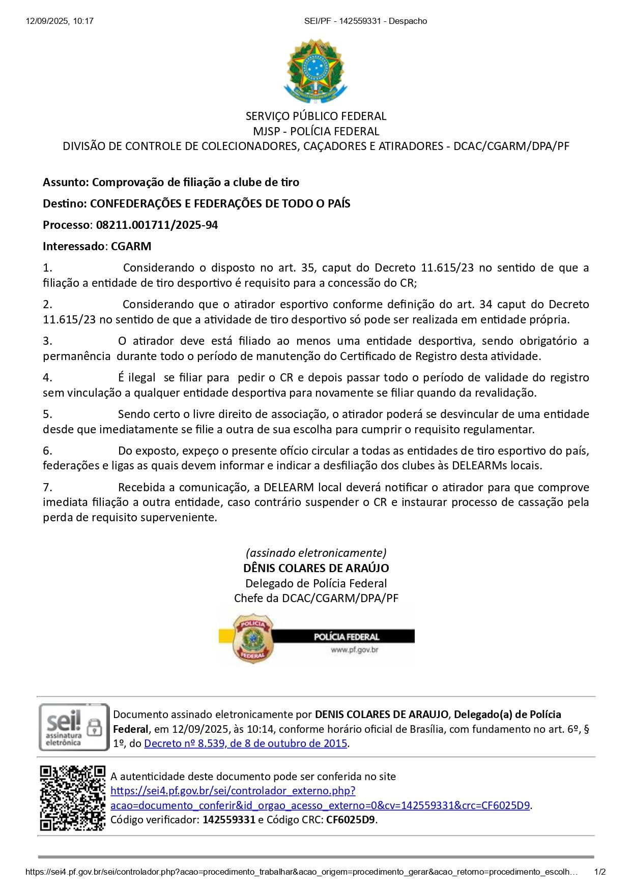 A Polícia Federal, por meio da Divisão de Controle de Colecionadores, Caçadores e Atiradores (DCAC/CGARM/DPA/PF), emitiu ofício circular nesta sexta-feira (12) para todas as entidades de tiro esportivo do país, reforçando a exigência de comprovação de filiação a clubes, federações ou ligas como condição indispensável para a concessão e manutenção do Certificado de Registro (CR).