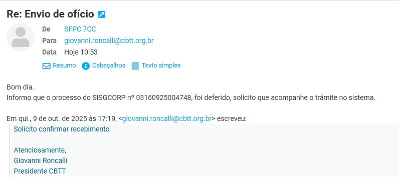 O presidente da CBTT, Giovanni Roncalli, concluiu o ofício solicitando resposta formal com as medidas adotadas para sanar o problema.